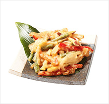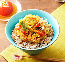 ※「夏越ごはん」とは、雑穀ごはんの上に、「茅の輪」をイメージした、緑や赤の旬の夏野菜を使った丸いかき揚げをのせ、おろしだれをかけたものを基本としています。